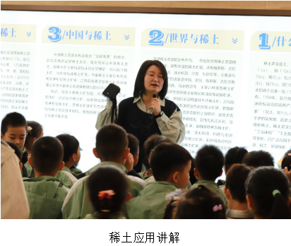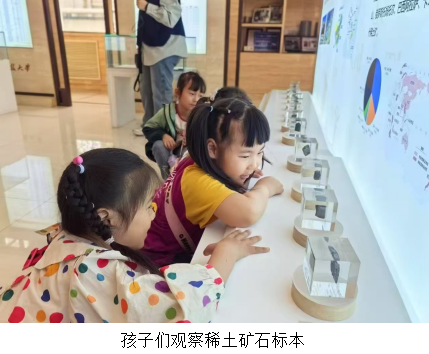 走进稀土产业学院的稀土产品展示厅,就像踏入了一个五彩斑斓的科学世界。赵烨老师如同知识渊博的导游,带领孩子们探索“工业维生素”稀土的奇妙应用。那些色彩斑斓的稀土矿石标本和互动模型,在赵老师的讲解下,成为了打开孩子们科学兴趣之门的钥匙。孩子们了解到稀土在电子设备、环保材料等众多领域的神奇作用,一个个眼神中满是对稀土元素“七十二变”的好奇与向往,探索科学的种子在他们心中悄然种下。