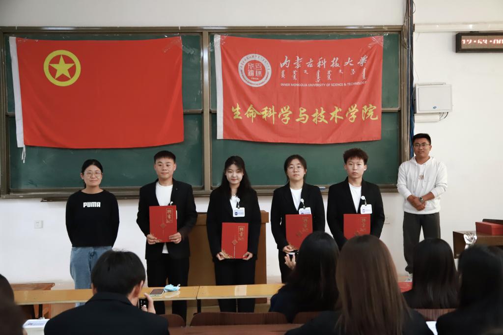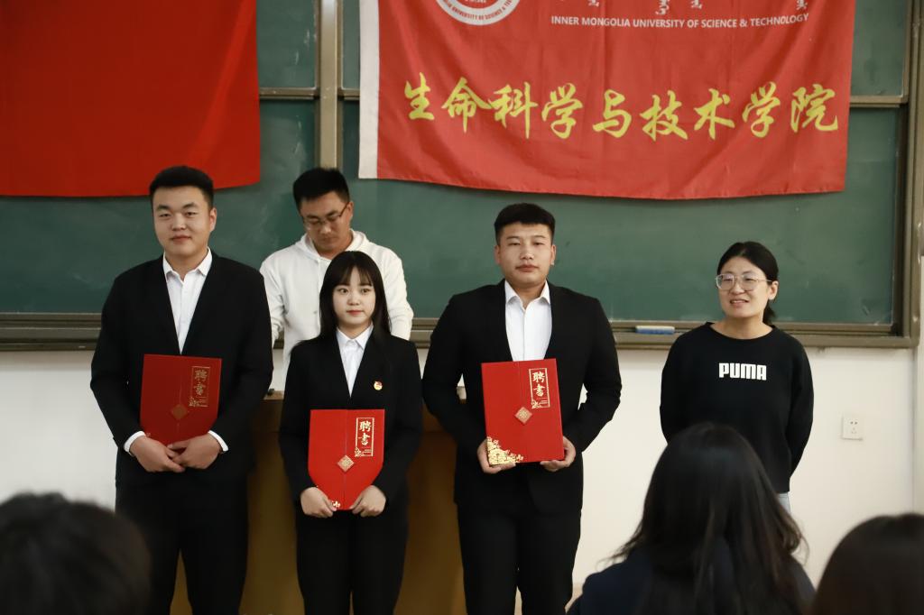 大会第三项:聘任2023届团学组织主席团。(1)乌日根老师宣读2023届团学组织主席团成员名单:主席团主席许双丁同学、团总支副书记孙悦同学、副主席昝梓萌同学、副主席杜志豪同学;(2)张超老师为2023届团学组织主席团成员颁发聘书和工作证,并对2023届团学组织未来一年的工作做出简要期许;(3)2023届主席团成员依次介绍了自己及分管部门,并对任期内所承担工作做出表态与承诺。