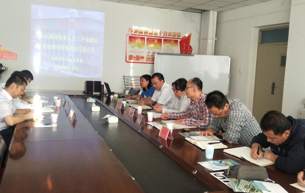2019年4月22日下午,包头市九原区绿色食品加工产业园区管委会主任康建明、办公室主任张鹏、规划建设科科长郝斌奎等一行3人来太阳集团tyc9728走访座谈。学院党政教领导、相关教师出席座谈会。