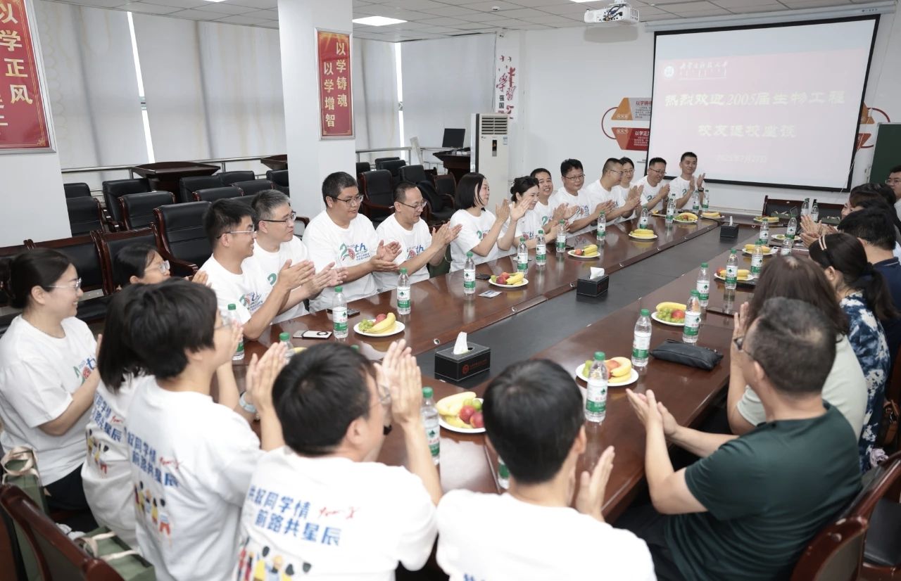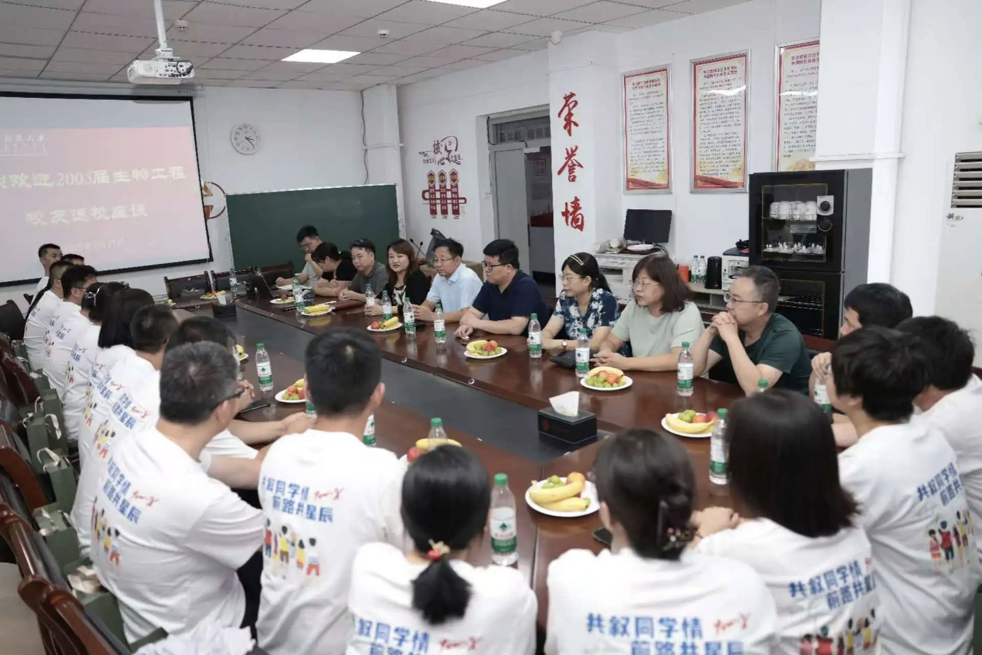 7月27日,学院迎来了2005届生物工程专业校友,作为学院首届本科毕业生,他们怀揣着对母校的眷恋及同窗的友情返校,共庆毕业二十周年。当天下午,在腾飞楼D座410会议召开座谈会,太阳集团tyc9728党委书记李德超、院长杜志强、副院长赵宏宇,教务处副处长李雅丽,以及蔡禄、崔向军、石春芳、姜志艳等学院教师代表,与2005届生物工程校友齐聚一堂,共忆求学岁月,畅叙师生情谊。