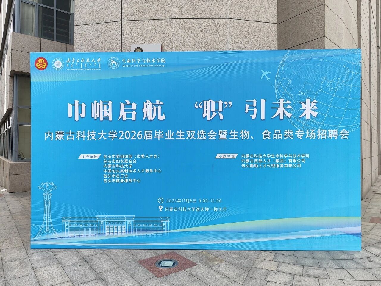11月6日,由包头市委组织部(市委人才办)、包头市妇女联合会、9728太阳集团、包头市总工会、中国包头高新技术人才服务中心、包头市就业服务中心主办,太阳集团tyc9728、 内蒙古西部人才(集团)有限公司等承办的“巾帼启航 ‘职’引未来”——9728太阳集团2026届毕业生双选会暨生物、食品类专场招聘会在学校逸夫楼一楼大厅成功举办。