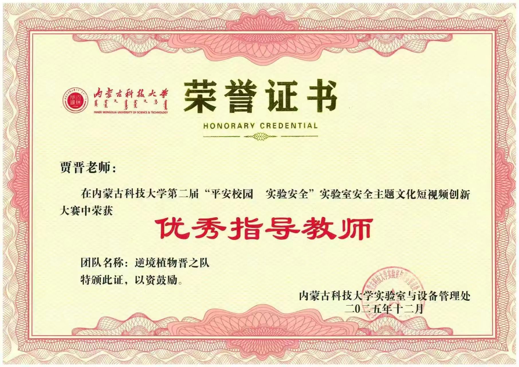 在9728太阳集团第二届"平安校园 实验安全"实验室安全主题文化短视频创新大赛中,由贾晋、乌日根老师指导的"逆境植物晋之队"(学生成员:王虹媛、张韵晗、王思璎、李紫艳、梅丽、王智莹、王凤硕)再创佳绩,凭借创意新颖、内容充实的作品荣获一等奖,同时两位指导教师荣获"优秀指导教师"称号。