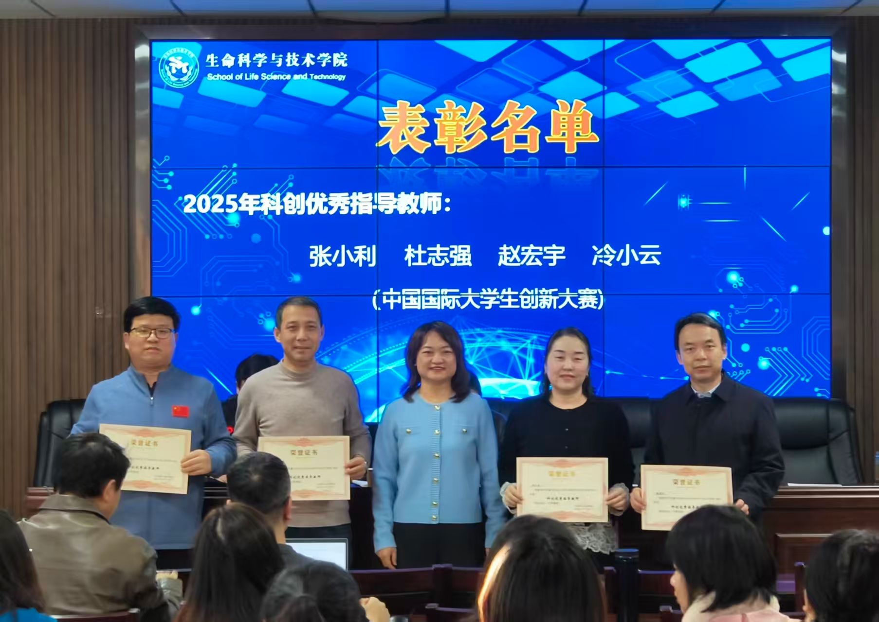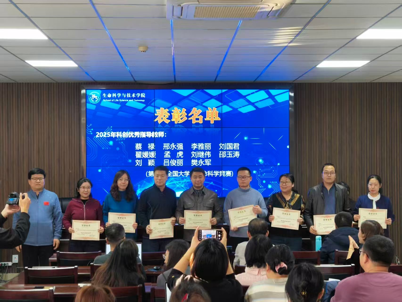 会议伊始,杜志强院长宣读了学院2025年度科技创新先进表彰决定。随后,在热烈的掌声中,2025年获奖师生先后登台,从院领导手中接过承载着肯定与敬意的证书。