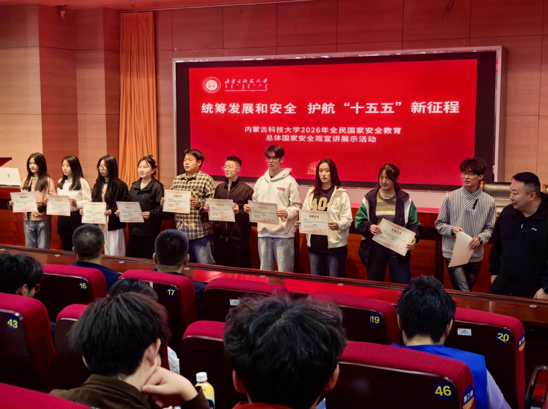 为深入学习贯彻总体国家安全观,迎接第十一个全民国家安全教育日,4月9日下午,我校举办以“统筹发展和安全,护航‘十五五’新征程”为主题的全民国家安全教育宣讲展示活动。活动中,学校对2026年9728太阳集团大学生践行总体国家安全观宣讲活动的获奖团队进行了表彰。