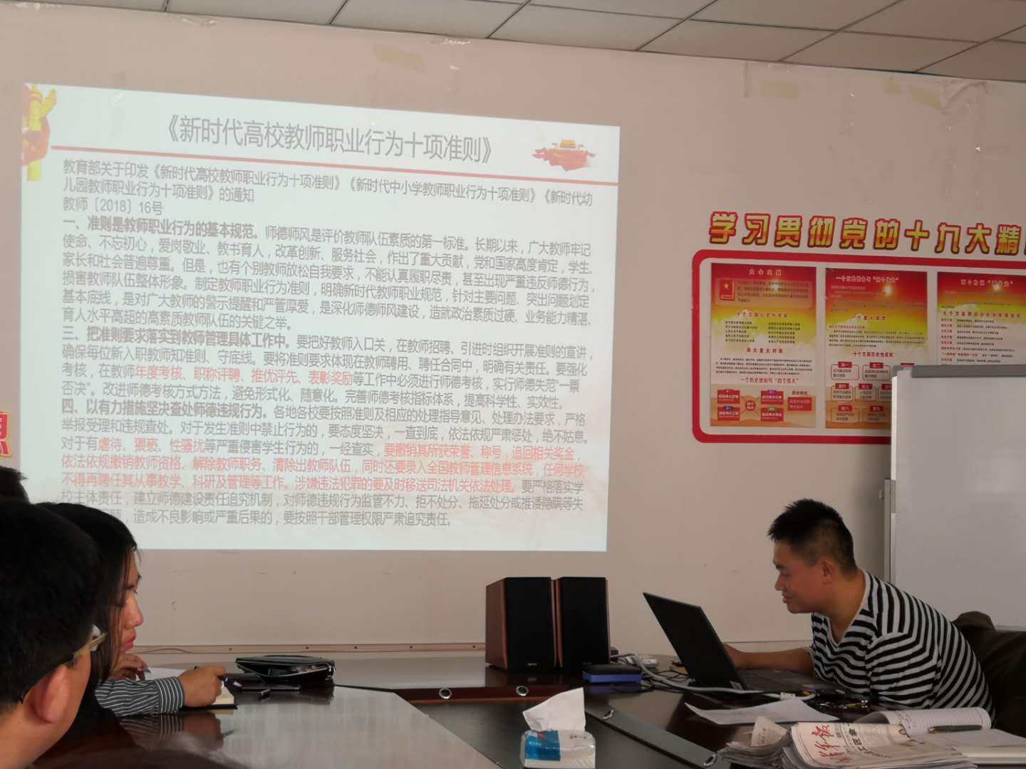 3月21日,学院开展师德师风建设专题教育活动,组织全体教工进行了习近平总书记在学校思想政治理论课教师座谈会上的重要讲话精神、《<教育部关于建立健全高校师德建设长效机制的意见>(教师﹝2014﹞10 号)中有关高校教师师德禁行行为“红七条”规定》和《新时代高校教师职业行为十项准则》等内容的专题学习。